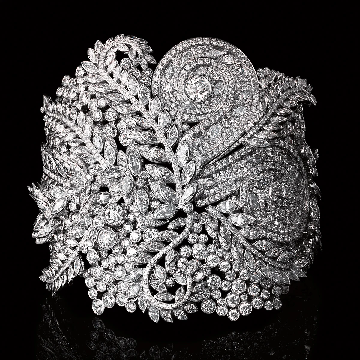 FB: Inspired by 1960s sketches from the Tiffany Archives, the curves and swirls of the fern are reimagined in a wild profusion of gemstones.